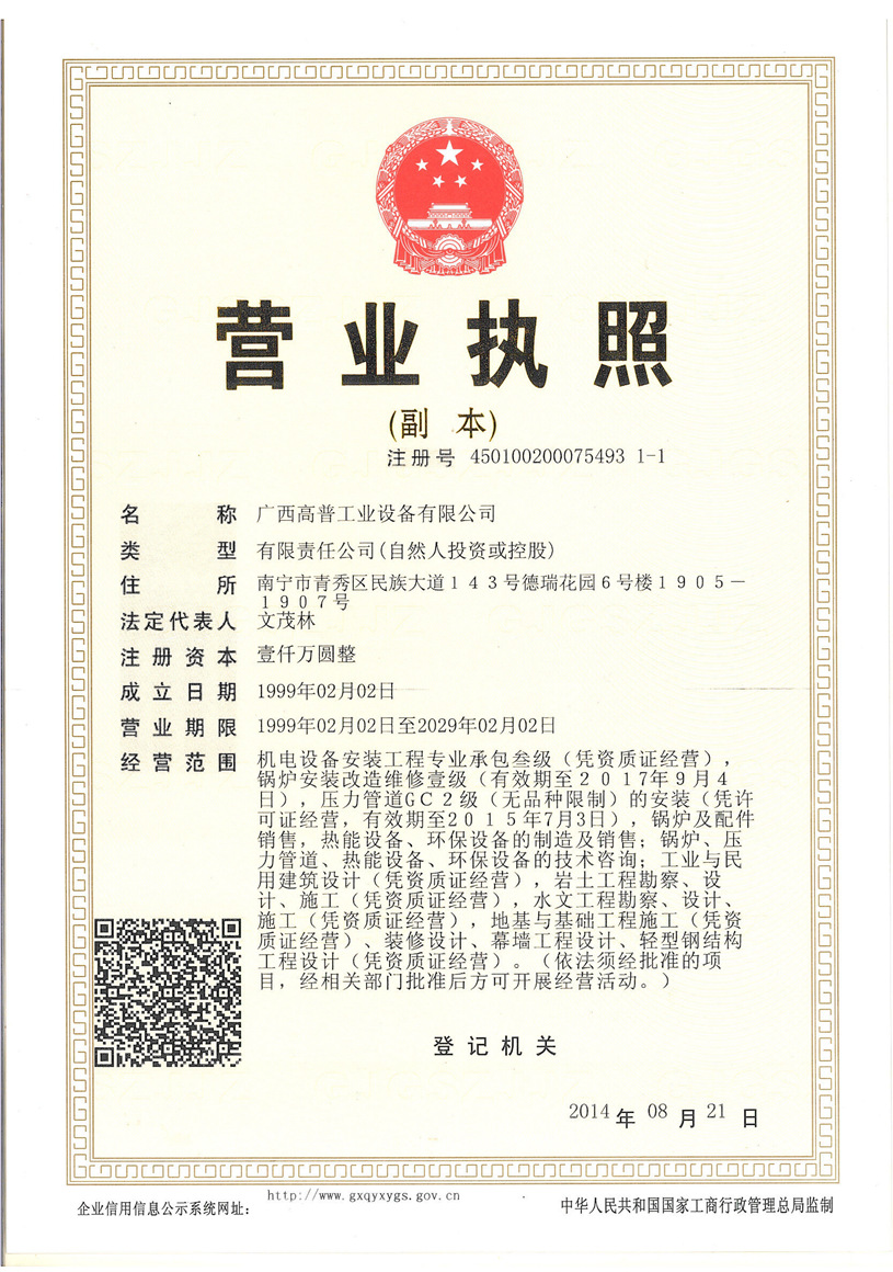廣西高普工業設備有限公司的前身是南寧高普熱能設備有限公司,是一家成立于1998年,具有獨立企業法人資格的的有限責任公司。公司總部設在廣西首府南寧。在云南、宜賓等多處地方、地區設有辦事及分公司。
